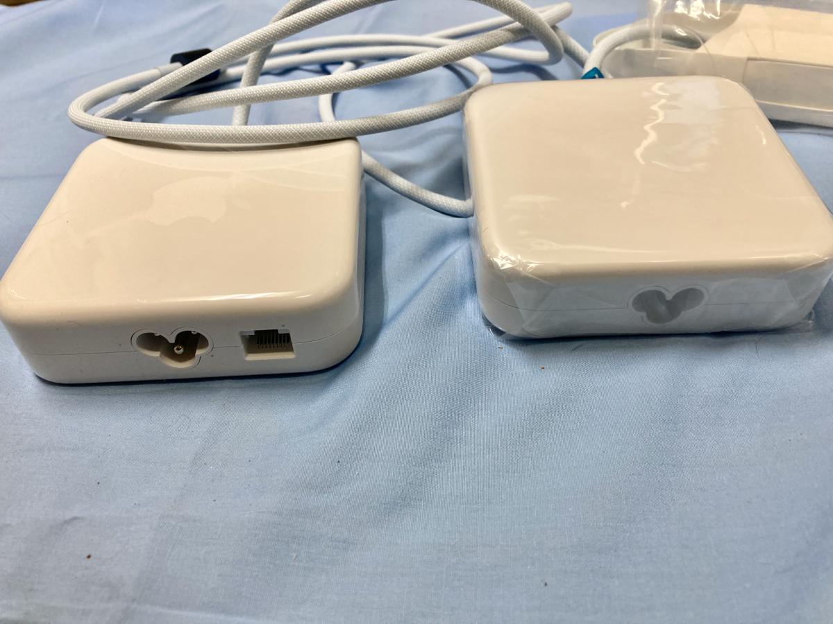 iMac2021の電源アダプターには、2バージョンありEthernetポートという四角い穴が空いている写真左のタイプと、Ethernetポートの穴が空いていない、写真右のタイプ。